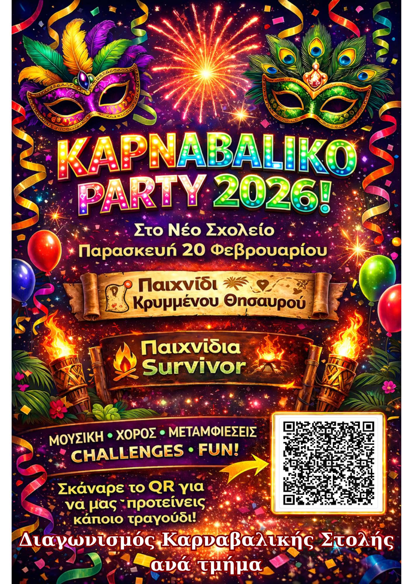 Με μεγάλη επιτυχία πραγματοποιήθηκε η αποκριάτικη εκδήλωση του σχολείου μας, γεμίζοντας τον χώρο με χρώματα, γέλια και αστείρευτο κέφι.